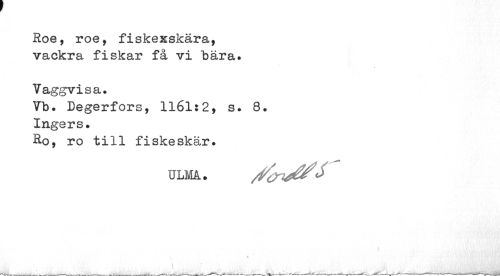 //// Roe, roe, fiskexskära, vackra fiskar få vi "bära. //// Vaggvisa. //// Vb. Degerfors, 1161:2, s. 8. Ingers. //// Ro, ro till fiskeskär. //// ULMA. <> //// i //// . * ¦ j i','•' ////