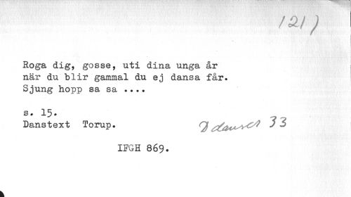 //// /£/) //// ! i //// J //// I //// Roga dig, gosse, uti dina unga år när du blir gammal du ej dansa får. Sjung hopp sa sa ... //// s. 15. //// Danstext Torup. Q ' ^ i //// IFGH 869. //// k ////