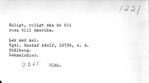 //// / 3 3 / //// \ //// Roligt, roligt ska de bli resa till Amerika. //// Lek med mel. //// Vgtl. Gustaf Adolf, 10796, s. 4. //// Stålberg. //// Lekmelodier. //// 1 //// 9 & ^ ULMA. //// k ////