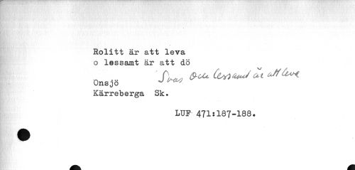 //// Rolitt är att leva o lessamt är att dö //// Onsjö 'JW ^ Ce"**J*t ^^ //// Kärreberga Sk. //// LUF 471i 187-188. ////