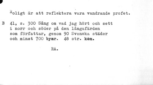 //// ^oligt är att reflektera vara vandrande profet. //// B 41, s. 300 Sång om vad jag hört och sett i norr och söder på den långafärden som författar, genom 90 Svenska städer och minst 700 byar. 48 str. kom. //// RÅ. ////