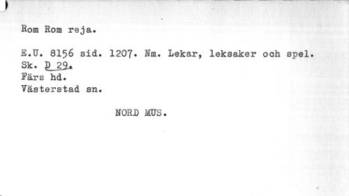 //// Rom Rom reja. //// E.U. 8156 sid. 1207. Nm. Lekar, leksaker och spel. //// Sk. D 2%. Pärs hd. Västerstad sn. //// NORD MUS. ////