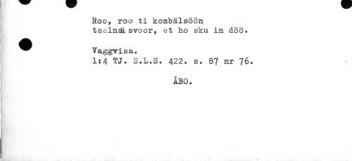 //// Roo, roo ti kombälsöön tseln& svoor, et ho sku in döö. //// ^^ Vaggvisa. //// 1:4 TJ. S.L.S. 422. s. 87 nr 76. //// ÅBO. ////