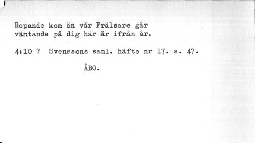 //// Ropande kom än vår Frälsare går väntande på dig här år ifrån år. //// 4:10 ? Svenssons saml. häfte nr 17* s. 47* //// ÅBO. //// % ////