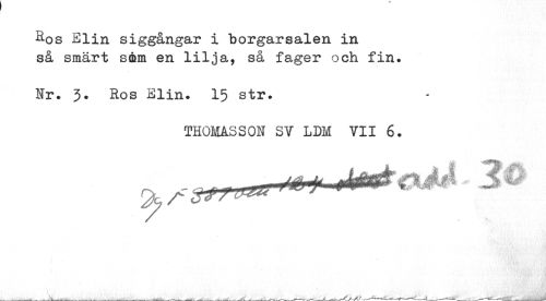//// Ros Elin siggångar i borgarsalen in så smärt söm en lilja, så fager och fin. //// Nr. 3. Ros Elin. 15 str. //// THOMASson SV LDM vii 6. ////