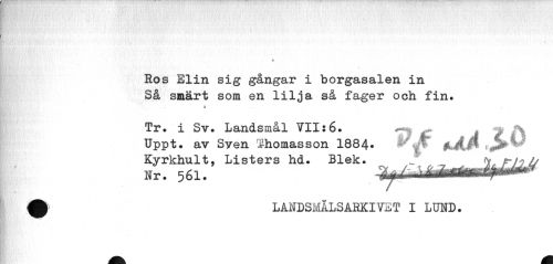//// a //// Ros Elin sig gångar i borgasalen in Så smärt som en lilja så fager och fin. //// A //// Tr. i Sv. Landsmål VII:6. ^ ^ * j% //// Uppt. av Syen Ihomasson 1884« J^ //// Kyrkhult, Listers hd. Blek. ^ ^J^{^^fg^^i^f^^ //// 0 LANDSMÅLSARKIVET I LUND. ////