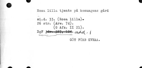 //// Rosa lilla tjente på konungens gård //// si.d. 33* (Rosa lilla)*- //// 26 str. (Arw. 74) • //// (G Afz. II 21). //// GÖT FÖRB KVHAA. //// Is v i'i* ////