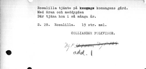 //// .: i . //// Rosalilla tjänte på ksHgÄga konungens gård. //// Med äran och meddygden //// Där tjäna hon i så många år. //// S. 28. Rosalilla. 19 str. mel. //// COLLIMDER FOLKVISOR. ////