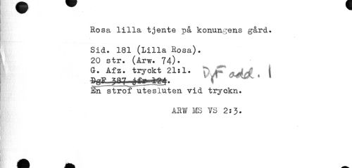 //// Rosa lilla tjente på konungens gård. //// Sid. 181 (Lilla Rosa). 20 str. (Arw. 74). //// Én strof utesluten vid tryckn. //// ARV/ MS YS 2:3. ////