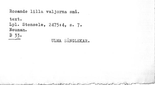 //// j //// Rosande lilla valjorna små. text. //// Lpl. Stensele, 2475:4, s. 7. Neuman. D 33. //// --* ULMA. SÅNGLEKAR. //// 1 //// 1 ////