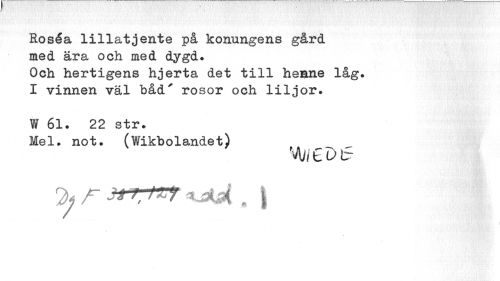 //// Roséa lillatjente på konungens gård med ära och med dygd» //// Och hertigens hjerta det till henne låg. I vinnen väl båd' rosor och liljor. //// W 61. 22 str. //// Mel. not. (Vikbolandet) //// 'Aj, t D t~ //// tyrxTKt+M, i ////