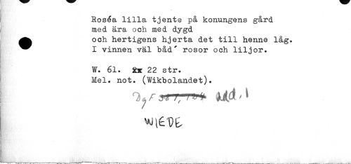 //// Roséa lilla tjente på konungens gård med ära och med dygd //// och hertigens hjerta det till henne låg. ^^ I vinnen väl båd' rosor och liljor. //// W. 61. Ssr 22 str. Mel. not. (Wikbolandet). ////