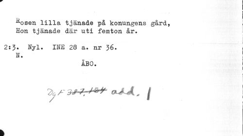 //// •^osen lilla tjänade på konungens gård, Hon tjänade där uti femton år. //// 2:3. Nyl. INE 28 a. nr 36. j //// N. | //// ÅBO. i //// I //// *2>cZé-Zr*** ouåJi, I | //// k ////