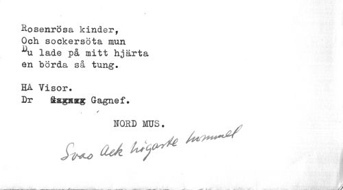 //// t //// Rosenrösa kinder, Och sockersöta mun //// lade på mitt hjärta en börda så tung. //// HÅ Visor. //// Dr SagKKg Gagnef. //// / //// NORD MUS. //// JU ^ ^ ^ - { ////