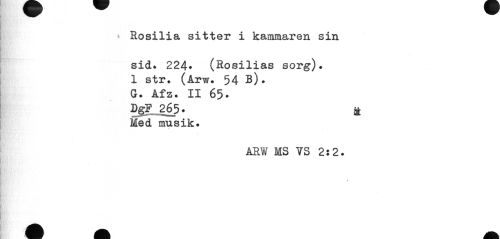 //// * Rosilia sitter i kammaren sin //// sid. 224* (Rosilias sorg). 1 str. (Arw. 54 B)* G. Afz. II 65- //// Dg? 265. ä //// Med musik. //// ARW MS VS 2;2. ////