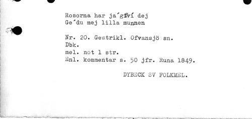 //// Rosorna har ja'gj£vi dej Ge'du mej lilla munnen //// Nr. 20. Gestrikl. Ofvansjö sn. Dbk. //// mel. not 1 str. //// Enl. kommentar s. 50 jfr. Runa 1849. //// DYBECK ST FOLKMEL. ////
