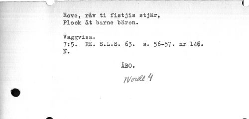 //// Rove, råv ti fistjis stjär, Plock åt barne bären. //// Yaggvisa. //// 7:5. RE. S.L.S. 63. s. 56-57. nr 14$. N. //// ÅBO. //// fVtridé. //// ¦ ////