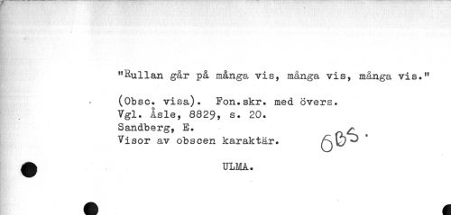 //// "Rullan går på många vis, många vis, många vis.11 //// (Obsc. visa). Fon.skr. med övers. Vgl. Åsle, 8829, s. 20. Sandberg, E. ^ //// Visor av obscen karaktär. //// ^ ULMA. //// « ////