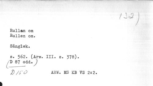 //// /JJ i //// Rullan om Rullen om. //// Sånglek. //// s. 562. (Arw. III. s. 378). D 87 odd. //// %) /TO ARV». MS KB VS 2:2. //// k ////