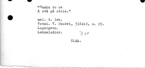 //// I|jiunka ro re å stå på stole.11 //// ^^ mel. t. lek. //// Vstml. V. Skedvi, 3164:2, s. 25. Lagergren. //// Lekmelodier. ? ^q //// ULM. ////