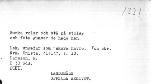 //// nif //// i //// i //// ...I //// I //// Runka rolar och stå på stolar och feta gumsar de hade han. //// Lek, ungefär som "skära havre, ^on skr. //// Nrk. Knista, 41sl47> s. 10. //// Larsson, R. //// 3) 30 odd. //// DuBT. //// LANDSMÅLS UPPSALA ARKIVET. //// i ////