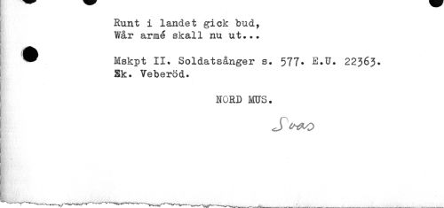 //// Runt i landet gick bud, Wår armé skall nu ut... //// ® Mskpt II. Soldatsånger s. 577. E.U. 22363. //// Sk. Veberöd. //// NORD MUS. //// J wo //// !'V. v-- ////
