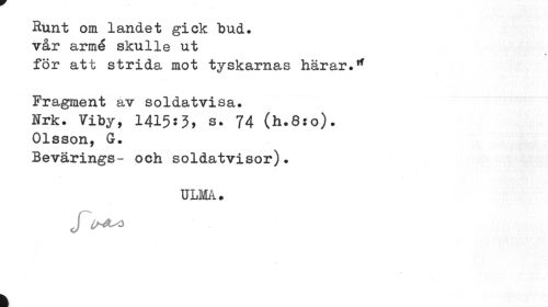 //// Runt om landet gick bud. vår armé skulle ut //// i //// för att strida mot tyskarnas härar.* Fragment av soldatvisa. //// Nrk. Viby, 1415:3, s. 74 (h.8:o). //// Olsson, G. //// Bevärings- och soldatvisor). //// ULMA. //// J Lh^ //// k ////