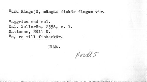 //// i //// Ruru Mångsjö, mångär fiskar fingum vir. 1 //// Vaggvisa med. mel. //// Dal. Sollerön, 2558, s. 1. //// Mattsson, Håll N. //// ^o, ro till fiskeskär. //// / //// i //// ULMA. //// i //// t i //// ^ ii ^ > >vj>v ">--, _---^ ////