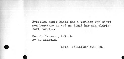 //// V . ¦ ' . - ¦ • , m //// ¦ //// ¦ i • //// m //// ¦ //// Ryseliga saker hända här i världen var minut men hemskare än vad nu timat har man aldrig hört förut... //// Se: O. Jansson, E.V. b. Av A. Lidholm. //// ^ KB:s. SKILLINGTRYCKSREG. //// m * ////
