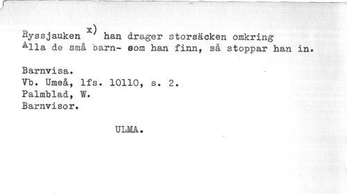 //// x) //// Ryssjauken han drager storsäcken omkring ^lla de små barn- eom han finn, så stoppar han in. //// Barnvisa. //// Vb. Umeå, Ifs. 10110, s. 2. //// Palmblad, ¥. //// Barnvisor. //// ULMA. ////