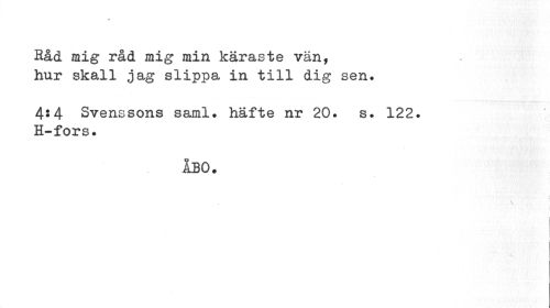 //// Råd mig råd mig min käraste vän, hur skall jag slippa in till dig sen. //// 4*4 Svenssons saml. häfte nr 20. s. 122. H-fors. //// ÅBO. //// i i ////