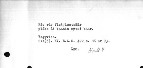 //// llBiAr!9f- • « s® ' > j • .'•• .•v• /«'?/• •:fr ' * ' •'»' " " vi'- » ¦ ¦•¦•.< ' '.-v • *v • y; •• • V-v T • •' ¦¦Wjt-vv^ ' • ;-¦ ••« .^iWv ••»' l > • •.* .- *.-v• . • y> •... • • •• ¦ ¦ • ¦> aJJ'- ¦ i» ••-.' .. BH", v' //// A //// rV;W I ': ' " ' ,'¦'• •' '' V V • ' ' . • ' ' ' //// r //// ¦ //// Råo råo fistjisstsäär plåkk åt baanin mytsi bäär. //// Vaggvisa. //// 2x4(5)• KV* S.L.S. 422 s. 86 nr 73. //// 130 • /v<n<u i ////
