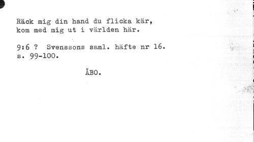 //// W I //// p //// i //// Räck mig din hand du flicka kär, kom med mig ut i världen här. //// 9:6 ? Svenssons saml. häfte nr 16. s. 99-100. //// s //// åbo. //// - ////
