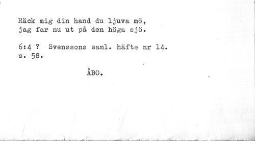 //// Räck mig din hand du ljuva mö, //// jag far nu ut på den höga sjö. j //// 6:4 ? Svenssons saml. häfte nr 14* s. 58. //// ÅBO. i //// 4 ! //// i //// i i //// I i //// f 1 ////