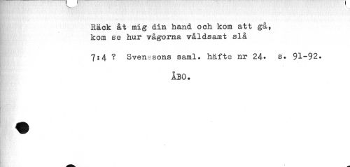 //// Räck åt mig din hand och kom att gå, kom se hur vågorna våldsamt slå //// 7;4 ? Svenssons saml. häfte nr 24» s. 91-92. //// > //// ÅBO. //// i ////