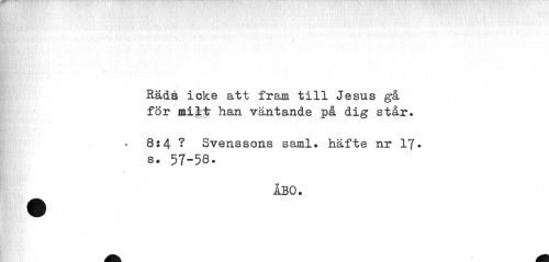 //// Räds icke att fram till Jesus gå för milt han väntande på dig står. //// 8:4 ? Svenssons saml. häfte nr 17* s. 57-58. //// ÅBO. ////