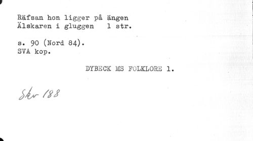 //// I //// Räfsan hon ligger på ängen j //// Ålskaren i gluggen 1 str, //// # //// s. 90 (Nord 84). //// SVA kop. //// DYBECK MS FOLKLORE 1. //// Sbr/S* ////