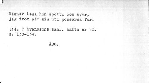 //// / ' ¦ //// Rännar Lena hon spotta och svor, jag tror att hin uti gossarna for. //// 3:4. ? Svenssons saml. häfte nr 20. //// s. I38-I39. //// ! //// ÅBO. I //// i //// 1 //// f C //// i //// ) //// i 1 //// 1 //// i i ////
