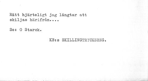 //// Rätt hjärteligt jag längtar att skiljas härifrån... //// Se: O Starck. //// KB:s SKILLINGTRYCKSREG. //// »V* , //// ) //// ___^ ___v — - ___ - ___- - — - . . 'i ft i ////