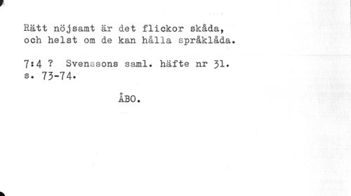 //// I //// Rätt nöjsamt är det flickor skåda, och helst om de kan hålla språklåda. //// 7:4 ? Svenssons saml. häfte nr 31. //// s. 73-74- //// ÅBO. ////