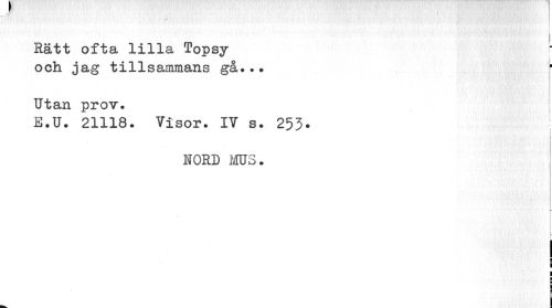 //// Rätt ofta lilla Topsy och jag tillsammans gå... //// Utan prov. //// E.U. 21118. Visor. IV s. 253- //// i //// NORD MUS. //// ffil //// i //// L //// i i //// i V //// s ¦ ////