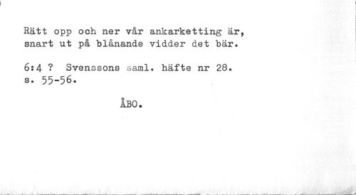 //// ¦ //// i i //// i //// Rätt opp och ner vår ankarketting är, snart ut på blånande vidder det bär. //// 6:4 ? Svenssons saml. häfte nr 28. s. 55-56. //// ÅBO. ////