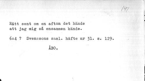 //// ¦ ¦ //// Rätt sent om en afton det hände att jag mig så ensammen kände. //// 6:4 ? Svenssons saml. häfte nr 31* s. 129* //// ÅBO. //// i //// ¦ //// i l ////