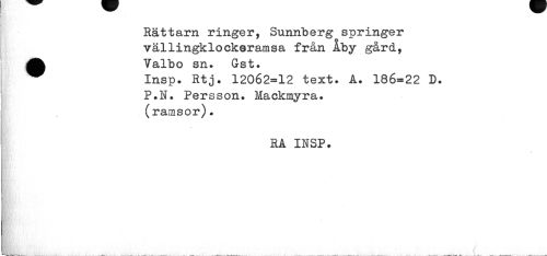 //// Rättarn ringer, Sunnberg springer vällingklockeramsa frän Iby gard, Valbo sn» Gst. W Insp. Rtj. 12062=12 text. A. 186=22 D. //// P.N. Persson. Mackmyra. (ramsor). //// RA INSP. //// 4 ////