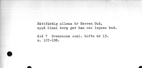 //// Rättfärdig allena är Herren Gud, uppå Sinai berg gav han oss lagens bud. //// 6:6 ? Svenssons saml. häfte nr 13* s. 107-108. ////