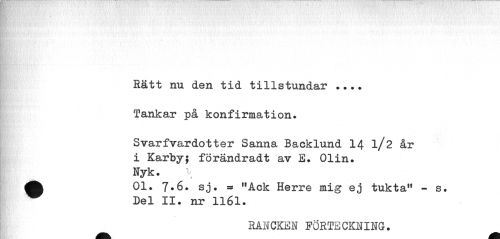 //// Rätt nu den tid tillstundar ...» //// Tankar på konfirmation. //// Svarfvardotter Sanna Backlund 14 l/2 år i Karby; förändradt av E. 01in. Ny k. \ //// ^fc 01. 7*6. sj. • "Ack Herre mig ej tukta" - s. //// W Del II. nr 1161. //// RANCKEN FÖRTECKNING. ////