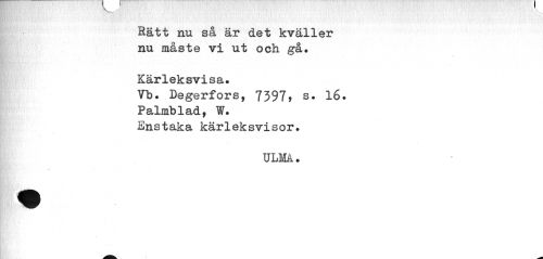 //// Rätt nu så är det kväller nu måste vi ut och gå. //// Kärleksvisa. //// Vb. Degerfors, 7397, s. 16. //// Palmblad, W. //// Enstaka kärleksvisor. //// ULM. ////