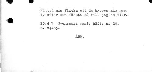 //// Rättså min flicka att du kyssen mig ger, ty efter den första så vill jag ha fler. //// " -m b > m m //// 10:4 ? Svenssons saml. häfte nr 20. s. 84^35. //// ÅBO. ////