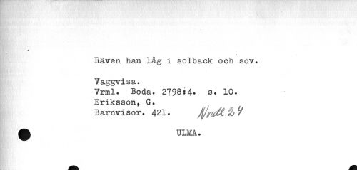 //// , ' ' ' ' '4' ¦ ¦ ¦' V/ • ' -" T Ti V,''fl //// « //// > ' //// Räven han låg i solback och sov. Vaggvisa. //// Vrml. Boda. 2798:4» s. 10. Eriksson, G. //// Barnvisor. 421. J{ffV$> //// 0 ULMA. ////