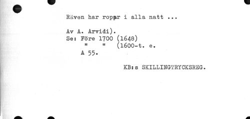 //// Räven har ropjar i alla natt ... //// Av A. Arvidi). Ses Före 1700 (1648) //// " " (l600-t. e. //// A 55. //// KB:s SKILLINGTRYCKSREG. ////